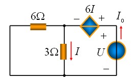根據電路聯接關系,得到U=6I+3I=9I(KVL),I=I0´6/(6+3)=(2/3)I0(并聯分流),所以U=9´(2/3)I0=6I0,Req=U/I0=6Ω