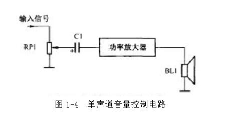 單聲道音量控制器是各種音量控制器的基礎(chǔ),圖1-4是單聯(lián)電位器構(gòu)成的的單聲道音量控制電路,它實際上是一個電阻分壓電路,電位器RP1相當(dāng)于兩個分壓電阻。