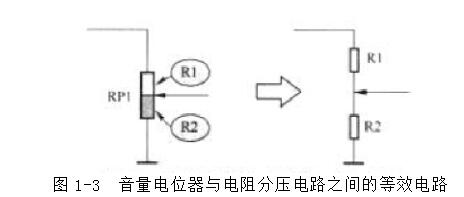 音量電位器在電路中相當(dāng)于電阻的一個分壓電路,圖1-3為音量電位器與電阻分壓電路之間的等效電路圖,其中RP1為音量電位器。