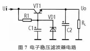 02 電子穩壓濾波器圖7所示是另一種電子穩壓濾波器。與前一種電路相比,在VT1基極與地端之間接入了穩壓二極管VD1。