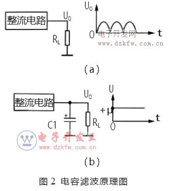 在電源電路的濾波電路中,利用電容器的“隔直通交”的特性和儲能特性,或者利用電感“隔交通直”的特性可以濾除電壓中的交流成分。圖2所示是電容濾波原理圖。