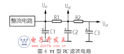 圖4所示是π型RC濾波電路。電路中的C1、C2和C3是3只濾波電容,R1和R2是濾波電阻,C1、R1 和C2構成第一節π型的RC濾波電路,C2、R2和C3構成第二節π型RC濾波電路。由于這種濾波電路的形式如同希臘字母π和采用了電阻器、電容器,所以稱為π型RC濾波電路。