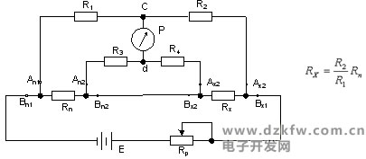 R1-R4為橋臂電阻,阻值很小,一般不超過0。5Ω。如果能在制造電橋時,使R2=R3,R1=R4并精心同步調整,滿足R2R3=R1R4則被測電阻為