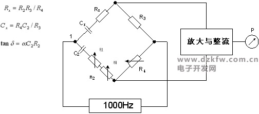 1)測量電容時,橋體連接成圖下圖所示的串聯電容電橋(維恩電橋)。被測的電容接在1/2兩端,Cx為被測電容的容量,Rx是他的燈效串聯電阻。調節橋臂中可調電阻使電橋平衡,此時,根據電橋的平衡條件:ZxZ4=Z2Z3可導出