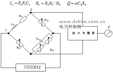 2)測量電感時,橋體連接成如下圖所示(麥克斯威電橋)。被測電感接在1、2兩端,LX是它的電感量,RX是它的等效串聯損耗電阻。當電橋平衡時有