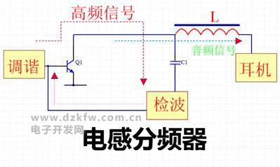 所謂線圈的分頻作用是運用電感線圈去區(qū)分高頻信號和低頻信號。比如在收音機中可以運用線圈構(gòu)成高頻阻流圈,由線圈制成的高頻阻流圈它對高頻電流的感抗非常大,而對音頻信號阻礙就非常小,因此三極管VT集電極輸出的高頻信號就會通過電容C進入到檢波電路中,檢波后的音頻信號再次經(jīng)三極管VT放大后,然后通過線圈L到達耳機,這樣我們就可以聽到聲音了,其原理圖如下圖所示。