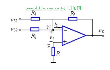反相端輸入電流ii=0的概念,通過r2與r1的電流之和等于通過rf的電流故(vs1–v-)/r1+(vs2–v-)/r2=(v-–vo)/rf…………b.