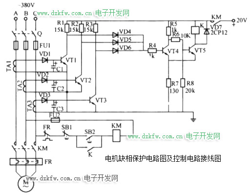 當電動機起動或運轉時一相斷相,導致VT1~VT3之一截止,使VT4導通,VT5截止,K失電,KM斷電,電動機停轉,以避免電動機缺相運轉而燒壞。圖中VT1~VT4可用3DG6型,VT5用3DG12型,K為JR-4型。