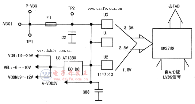 如果TP1有電壓,而TP2無電壓,則說明屏供電的負載電路有嚴重短路元件。最常見的是電源濾波的貼片電容漏電或嚴重短路,DC-DC元件擊穿損壞造成保險Fl燒斷開路。如果TP2有電壓,但低于正常值,說明屏供電的負載電路有漏電或輕微短路元件。檢修時,直接測量TP2的對地電阻。如果TP2對地電阻在300Ω左右,則查3.3V、2.5V、1.8V(有的屏不一定有這個電壓)負載,通常是三端精密穩壓器(如1117系列)性能不良、主控芯片(本機為CM2709,相對其他方案,這種芯片的損壞率比較高)損壞;若TP2對地電阻在100Ω左右,則查DC-DC調節電路。屏DC-DC電路的功能是為屏內部的行、場陣列模塊提供正常工作所需的各組電壓。雖然屏的型號非常多,每個廠家對這些電壓的標注并不統一,但原理都是一樣的,所以,可以用“柵極電壓”來加以概述(詳細的工作原理,可參考雜志社出版的《液晶顯示器維修實戰教程》的相關章節)。如圖1所示:VGH,指柵極高壓,一般在18V~25V之間;VGL,指柵極低壓(負壓),一般在-6V~-10V之間;VCOM,指共柵極電壓,一般在9V~12V之間。還有一個VDDA,這個跟屏供電P-VCC接近,本機為5V。通常,這些電壓在邏輯板的PCB上都有明顯的標注。