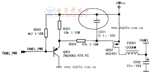 正常開機后,MCU從PANEL-PWR輸出低電平使Q301導通,P溝場效應管Q302導通,CMVcc(+5V)經FB301給屏提供5V電壓。