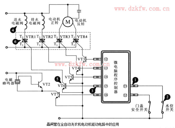 當(dāng)某三極管基極有高電平時(shí),三極管便導(dǎo)通,相應(yīng)的晶閘管被觸發(fā),被控制的電磁閥動(dòng)作,如開(kāi)始洗滌,微電腦程序控制器的23腳連接的水位開(kāi)關(guān)和15腳連接的進(jìn)水電磁閥配合工作,控制洗滌桶內(nèi)的注水量。當(dāng)水位達(dá)到預(yù)定水位后,微電腦程序控制器將進(jìn)水電磁閥的控制三極管VT6截止,晶閘管VTR1截止,則停止向洗滌桶內(nèi)注水。