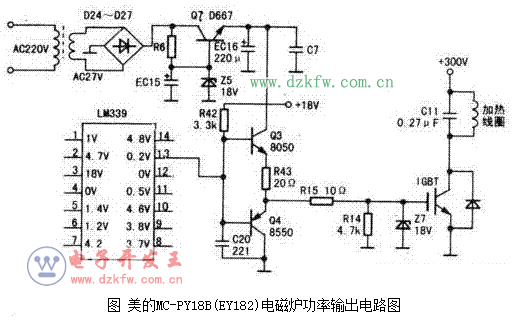 下面以美的MC-PY18B(EY182)電磁爐(如圖所示)為例,對“燈泡法”作進(jìn)一步說明。上電開機(jī)測試后,燈泡會亮說明故障沒有排除.檢測R15電阻的對地電壓,如果電壓為+1V以上則檢查下述元器件,直到檢測燈泡不亮,故障排除,才可以接入發(fā)熱線盤。若燈泡亮,其故障原因為:共振電容C11漏電;三極管Q4基極與發(fā)射極斷路損壞;R15電阻變值;三極管Q7集電極與發(fā)射極擊穿;穩(wěn)壓二極管Z5開路;LM339損壞,使①腳電壓上升;電腦芯片損壞。