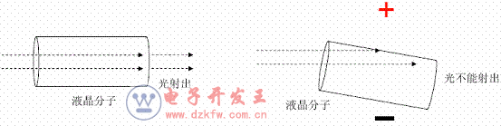 當一個長棒型的液晶分子由一端射入光線是,由于液晶分子有良好的透光性能,光線可以順利的由另一端射出, 下圖A所示。當液晶分子在電場的作用下發生扭曲,則阻礙光線的通過,下圖B所示;此時;可以通過改變電場的強度;達到控制液晶分子扭曲的角度;從而達到控制通過光線的強度的目的;也就是達到了;在熒光屏上控制像素點亮度的目的。