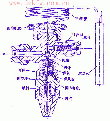 調(diào)節(jié)桿通過調(diào)整彈簧力的大小來調(diào)整膨脹閥的開啟過熱度。傳動桿頂在閥針座和膜片剛心之間以傳遞壓力。閥針座上裝有閥針,隨著傳動桿的上下移動,閥針也跟著閥針座一起移動,開大或關(guān)小閥孔。