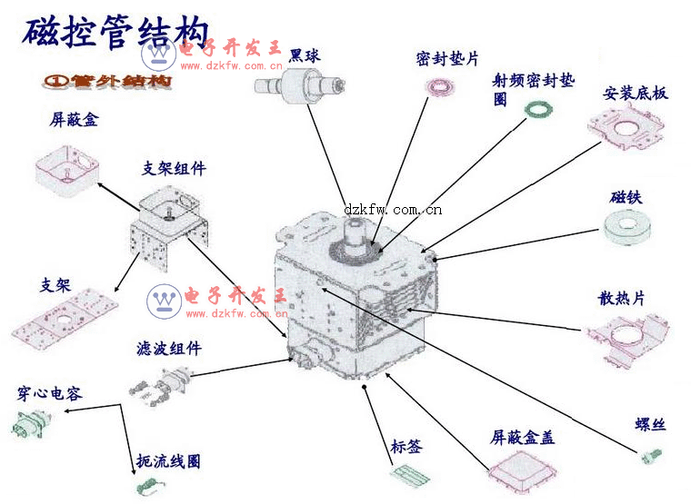 微波爐磁控管的構造原理磁控管是微波爐的關鍵器件,主要由管芯和磁鐵兩部分構成,如圖1。管芯由陰極、燈絲、陽極、天線(波導管)等構成。