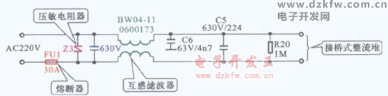 下圖所示為典型空調(diào)器的過壓保護(hù)電路原理圖。交流220V電壓經(jīng)過由熔斷器FU1和壓敏電阻器Z3組成的過壓保護(hù)電路后,由電容器和互感濾波器等濾除交流輸入電壓中的干擾和噪波,然后送到橋式整流堆進(jìn)行整流。