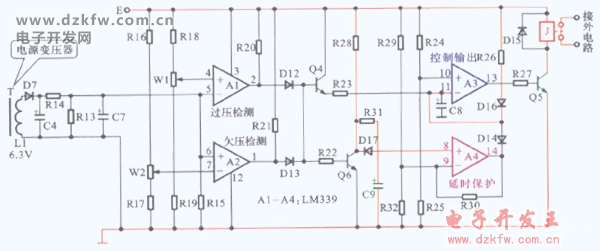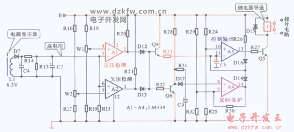空調(diào)器中設(shè)計(jì)的過壓保護(hù)電路形式較多,下圖所示為典型空調(diào)器中設(shè)計(jì)的過壓、欠壓保護(hù)電路。該電路主要由運(yùn)算集成電路LM339等元件構(gòu)成,其中,LM339內(nèi)部的運(yùn)算放大器A1用于過壓檢測(cè)、A2用于欠壓檢測(cè)、A3用于控制輸出、A4用于延時(shí)保護(hù)。