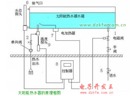 第四步、太陽能熱水器安裝步驟過程中我們還需要使用到的一個儀器是全智能控制儀。這種控制儀具有自動上水、定時上水、定溫上水、缺水保護、定時加熱等功能。全智能控制儀一般安裝在室內側墻上,按照下圖安裝即可。