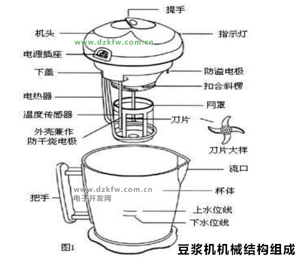 4、機頭:機頭是豆漿機的總成,機頭外殼分上蓋和下蓋。上蓋有提手、工作指示燈和電源插座。