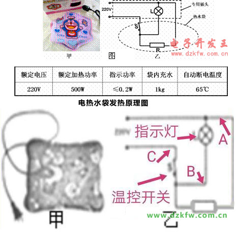 需要加熱時,將電源線插入電熱水袋插孔,指示燈(先與分壓電阻串聯)與發熱體并聯,溫控開關接在干路中,同時控制指示燈和發熱體。電熱水袋內液體溫度低于設定溫度(上題中是60℃)時,溫控開關閉合,發熱體發熱,指示燈發光;當達到設定溫度時,溫控開關自動斷開,發熱體停止加熱,同時,指示燈熄滅。