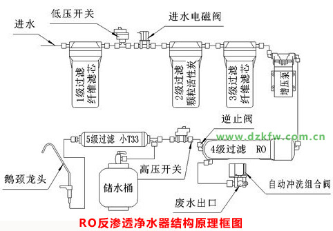 一般的反滲透凈水器均采用5級(jí)過濾的形式進(jìn)行過濾。如下圖: