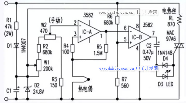 市電AC220V經(jīng)R1降壓、D1半波整流、D2削波穩(wěn)壓、C1濾波后作為比較器件IC的電源電壓及調(diào)溫設(shè)定電壓源。