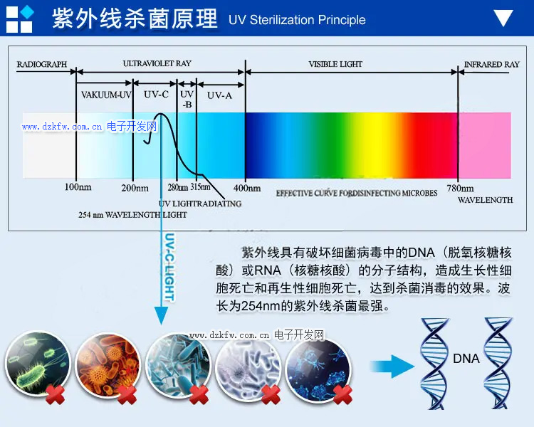 紫外線殺菌燈與日光燈、節能燈發光原理一樣,燈管內的汞原子被激發產生汞的特征譜線。低壓汞蒸氣主要產生254nm和185nm紫外線。日光燈、節能燈燈管采用的是普通玻璃,紫外線不能透出來,被熒光粉吸收后發出可見光;而殺菌燈燈管則用透紫錢玻璃或石英玻璃生產。紫外線穿過玻管壁透射出來。 當紫外線照射到微生物時,便發生能量的傳遞和積累,積累結果造成微生物的滅活,從而達到消毒的目的。紫外線一方面可使核酸突變、阻礙其復制、轉錄封鎖及蛋白質的合成;另一方面,產生自由基可引起光電離,從而導致細胞的死亡。