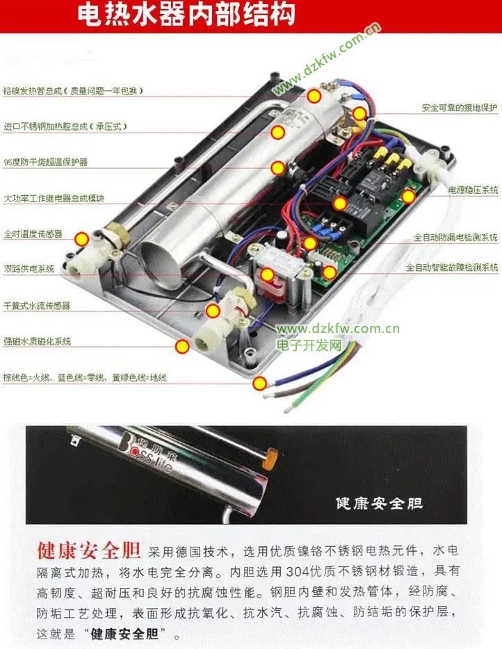 2)目前生產出的即熱式電熱水器大多數裝有專門防漏電保護裝置,第一種是: 專線連接,即熱式電熱水器的安裝一般都會讓用戶專接電源線的,并且還加裝了斷路器,這是一種漏電保護裝置,另外,它還加接了保護接地線;第二種是水電分離,它能夠讓發熱管和水絕對分離開來,發熱管的熱量是通過發熱體傳導到水中的,水流不是直接接觸到了發熱管的,這樣也不會出現觸電的現象,防止漏電情況出現;第三種是防漏電保護裝置,一旦機器內的微電腦控制系統發現有0-1mA的漏電現象出現,熱水器就會在0. 1s之內自動進行斷電,并且還會發出危險的警報,這樣就能夠減少觸電事故的出現;第四種是防電墻,目前高端的即熱式電熱, 水器大多裝備了國標防電墻,確保在內膽被擊穿帶電的情況下,也能保證人體的安全。