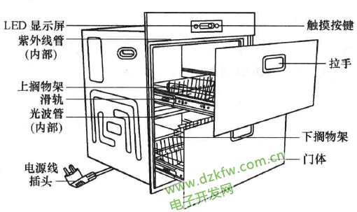 消毒柜外部結構主要由LED顯示屏、觸摸按鍵、拉手、門體、擱物架(由上層架和下層架組成,主要用于存放碗、盤、筷子、勺子等餐具)、電源線插頭、光波管、紫外線管等組成。下圖所示為消毒柜外部組成。
