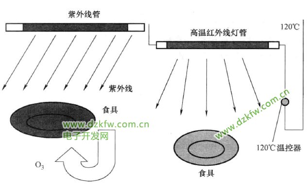消毒裝置是消毒柜的核心部分,是主要的功能部件之一。它主要由紅外線加熱管、臭氧發生器、紫外線管、熒光燈座、鎮流器、輝光啟動器等組成。紅外線加熱管用于高溫消毒、臭氧發生器和紫外線管用于低溫消毒和烘干。