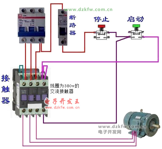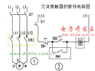 上圖是用接觸器控制電機(jī)的原理圖,圖1是主回路,圖2是控制回路,圖中黃色框內(nèi)就是接觸器的主觸點,藍(lán)色框內(nèi)是接觸器的輔助觸點,紅色框內(nèi)是接觸器的線圈。SB2是起動按鈕,SB1是停止按鈕,當(dāng)按下SB2時KM1線圈得電吸合,同時藍(lán)色框內(nèi)的KM1輔助觸點也閉合,松開SB2電機(jī)照常轉(zhuǎn)動,按下SB1時電機(jī)停止。下圖時交流接觸器接線圖,可以與上圖對照一下。