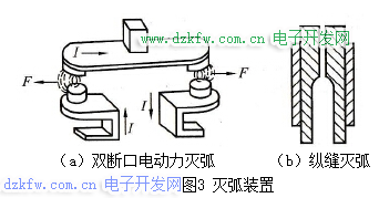 1)雙斷口電動(dòng)力滅弧。該種滅弧裝置如圖3 (a)所示。這種滅弧方法是將整個(gè)電弧分割成兩段,同時(shí)利用觸頭回路本身的電動(dòng)力F把電弧向兩側(cè)拉長(zhǎng),使電弧熱量在拉長(zhǎng)的過(guò)程中散發(fā)、冷卻而熄滅。容量較小的交流接觸器,如CJ10 - 10型等,多采用這種方法滅弧。