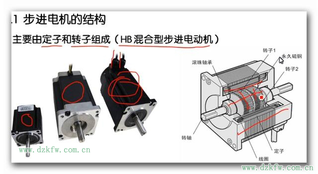 我們從左往右看啊,第一個小的,接著大的,右邊這個有兩股線的它是帶編碼器的,它是可以進行閉環(huán)控制的。我們最右邊的是步進電機的立體圖,有了這個立體圖呢就便于大家了解它的真式結構,它上面呢有定子、轉子(轉子上面有磁鋼有齒牙)、線圈、這個就是我們的混合式的步進電動機,現(xiàn)在是我們用的最廣泛的步進電機。大家再看一下下面是一個拆開的步進電機,這個比較直觀,如圖2: