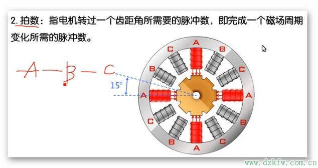 拍數:這句話是什么意思呢?比如說像這個A線圈4個線圈通電了,就要吸引它,那么我B線圈通電了(當然A線圈這個時候已經斷電),B線圈又吸引它,那么它就要轉一個齒(一個角度,15度),當這個B線圈通完電呢,C線圈又通電,通電就吸引它,那么它又轉一個角度,最后呢,它就是A線圈、B線圈、C線圈通完電之后,它又是下一個A線圈、B線圈、C線圈通完電之后,又是下一個ABC線圈通電之后,有最后一個ABC線圈通完電就是一個磁場周期,那么他需要的脈沖數呢就是ABC三個脈沖。