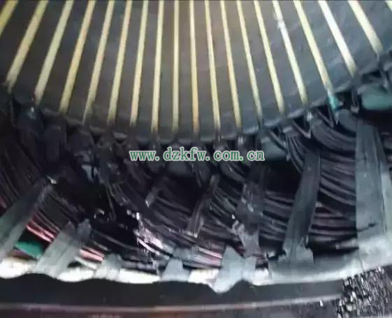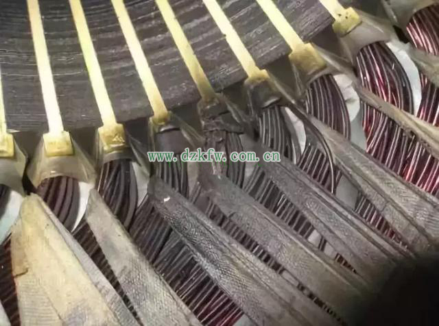繞組全部變黑色,端部扎帶變色并且變脆甚至斷裂。