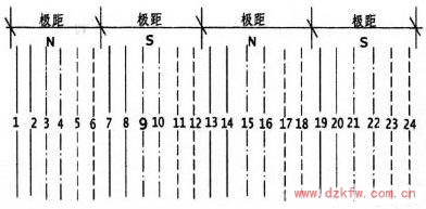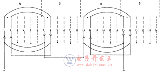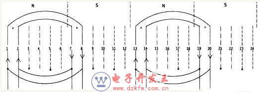 對于一個繞組而言,若規定了它的進出線的位置,按上圖第一個線圈是由第1槽進線(它位于N極),可以確定電流的流向是向上。而電流不管匝數有多少電流總是由第8槽流出(它位于S極),故電流的流向必定是向下的。又由于第2槽與第1槽同處于N極,故第2槽的電流方向與第1槽相同,同是向上。而第7槽則與第8槽一樣同處于S極,其電流流向相同,均向下。現我們來看第13、14槽它們位于N極與第1、2槽同極性故其電流方向應相同而向上,而第19、20槽則處于S極,故其電流流向與第7、8槽(處于S極)其流向相同,均向下。至此線圈的8個有效邊的電流方向均已確定,并把它標于圖上。