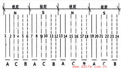 2、求出每極每相所占(即為極相組)槽數,即在一個磁極里(N或S)按三相平分所得的槽數。每相在每個磁極里均按A、C、B的規律排列,而每相所占的槽數必定相等。如下圖所示。