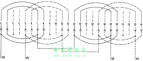 注:本接線與上圖有區別,即上圖是以單個線圈繞制的,故每個線圈均有二個出線頭,連接起來有更多的接頭。而本圖是以一大一小二個線圈共繞的,大線圈的出線與小圈的進線相連。圖中未標出,故每相只有四個線頭。圖中實線為A相,虛線為B相。