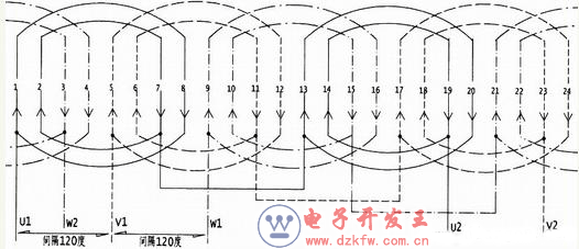 根據A、B二式的計算得知每槽電角度為30度,120度應占有4槽,即第1槽、第2槽、第3槽、第4槽。其累計和為120度。按累計和后的第一槽,即為第5槽。也就是說第二相進線應由第5槽進。