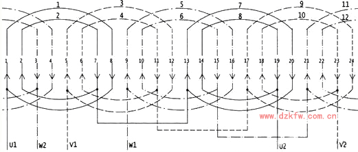 首先我們將繞組按線圈在圖上排列的順序進行編號;跨距1---8槽的編為1號線圈,跨距7---8槽的編為2號線圈------余類推,計有12個線圈,如上圖所示。