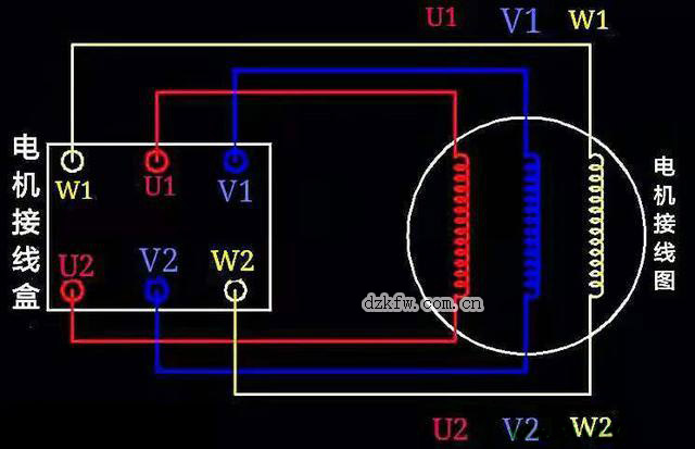 第二相繞組的首端和末端分別用V1、V2表示;第三相繞組的首端和末端分別用W1、W2表示。這6個首末分別引出至電機的外殼的接線盒中,并標注對應的符合用于電工人員的接線。