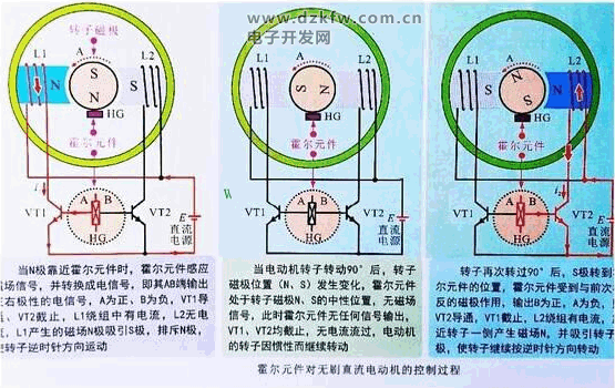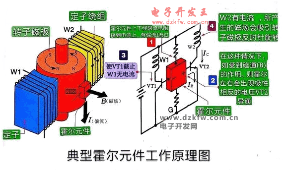 霍爾元件是一種磁感應傳感器,可以檢測磁場的極性,將磁場的極性變成電信號,送給對應的晶體管的控制極。定子繞組中的勵磁電流是根據霍爾元件的信號進行切換,這樣就可以形成旋轉磁場,驅動轉子旋轉。