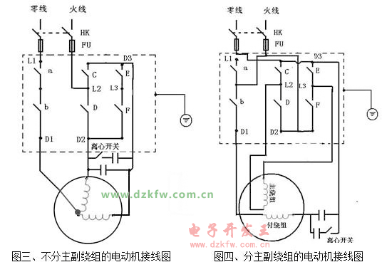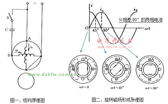 電容分相電動機的轉子繞組是澆筑成型的鼠籠式,定子上饒有2組空間位置上相差90°的啟動繞組B和工作繞組A,從而獲得電角度ω為90°的兩相交變電流,保證旋轉磁場的形成條件。(如圖一所示)
