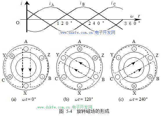 圖5-3表示最簡單的三相定子繞組AX、BY、CZ,它們在空間按互差1200的規律對稱排列。并接成星形與三相電源U、V、W相聯。則三相定子繞組便通過三相對稱電流:隨著電流在定子繞組中通過,在三相定子繞組中就會產生旋轉磁場(圖5-4)。