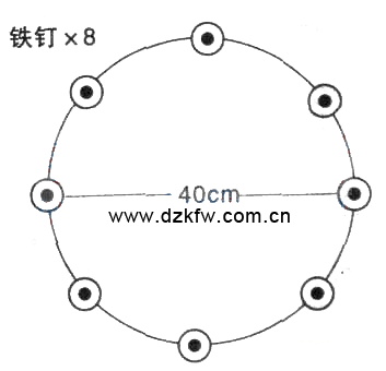 為了繞制長波線圈,可在一塊木板上,劃一40cm的圓環,再按等弧距釘上8根一定長度的鐵釘,構成簡單的框架,如圖所示。圍繞著框架,細心地用漆包線繞上1000匝線圈,完成之后用絕緣帶繞上,以保護線圈,然后把鐵釘去除,即可獲得完整的線圈,再把所得線圈固定到一木盒內。