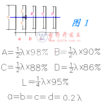 如果自制四單元八木天線,只要不安裝引向器D就可以,天線也會顯得小巧一點。如果想做成七單元,在上圖的基礎上加兩個引向器單元, 長度分別是半波長的84%,82%。 新加的單元的間隔仍是波長的0.2倍。