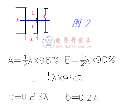 如果想做一支八木天線,但不要求方向性強,可以試試,動手做一支三單元八木天線。在此給處其尺寸(圖2)。
