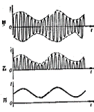 右圖是調(diào)幅裝置的示意圖.接在振蕩器和線圈之間的話筒就是一個(gè)最簡(jiǎn)單的調(diào)制器,由聲源發(fā)出的聲音振動(dòng)使話筒里的碳粒發(fā)生時(shí)松時(shí)緊的變化,它的電阻也發(fā)生時(shí)大時(shí)小的變化。所以,雖然振蕩器產(chǎn)生的是高頻等幅振蕩電流,但是線圈通過的卻是隨聲音而改變的高頻調(diào)幅電流.由于線圈的互感作用,從開放電路中發(fā)射的也是這種高頻調(diào)幅電流。這種電磁波叫調(diào)幅波。