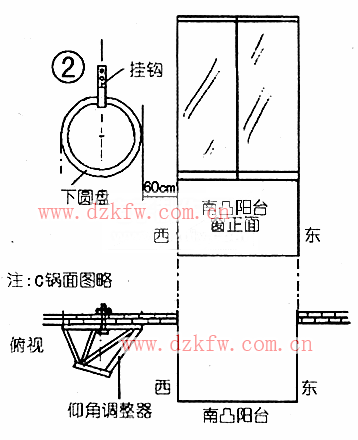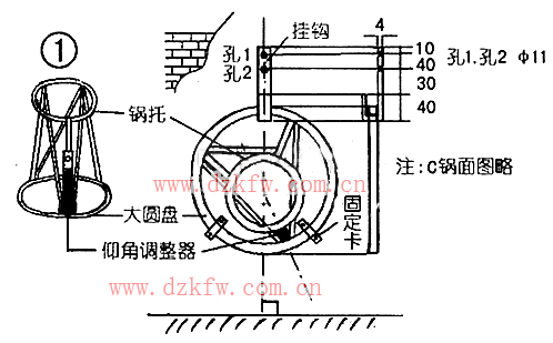 用指南針測得該樓朝向方位為165°,即朝南偏東15°(180°-15°=165°),為中國傳統的房屋朝向,該鍋安裝于三樓南凸陽臺的西側,被衛視朋友戲稱為”小馬桶”的C鍋支架。其大圓盤被鉤掛在一只固定在垂直墻面上的扁鐵鉤上,大圓盤的東邊緣距西側墻約600cm,“小馬桶”的仰角調整器在大圓盤的下方,支撐著整個鍋底(見圖1),如果將仰角調整器支桿與掛鉤的垂線(見圖2)重合的話,這個仰角調整器只能作調仰角用,一點新意也沒有,也不好用來實際調星,可最巧妙之處就是仰角調整器的支桿在掛鉤垂線的東側一點,調仰角的同時,方位角也在改變。提高仰角時,方位角向西移動,降低仰角時,方位角向東移動,配合調整C頭極化角,“三大角”調整得以實現,即實現尋星了。