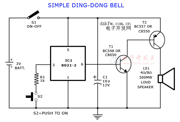 在這里,我們提出一個簡單和低成本的音調發生器電路,一個叮當鈴適合呼叫鈴purposes.It圍繞集成電路8021,它是一個8腳IC,但這里只有四個引腳。8021有一個內置的電路來產生叮當聲其第3腳被拉到低。聲音是在4位ROM.a互補對存儲的每個時間,兩個晶體管放大器是用來放大聲音,一個公平的水平audibility.A壓電高音喇叭或8歐姆,500mW的揚聲器可用于輸出。每次按下開關S2時,叮當聲制作的兩倍。如果您嘗試按開關S2的一個第一的叮咚聲仍在生產的第二次,它有沒有影響任何,兩個叮當的鐘聲聽起來總是produced.S1的ON - OFF switch.Assemble電路良好的質量上所有的目的PCB.Don'T忘記使用8021集成電路IC的人。
